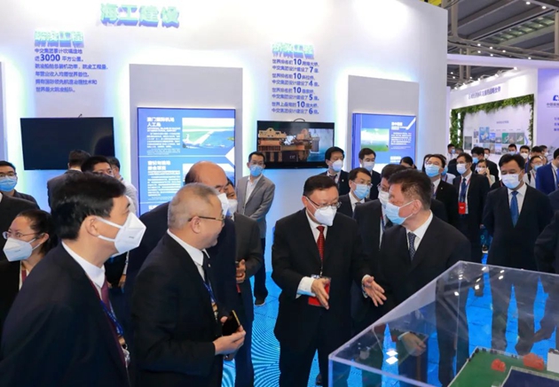 在王彤宙的陪同下,王宏、张占海、张虎等领导莅临中交集团展位参观指导。王彤宙介绍了中交集团的发展情况,重点介绍了中交集团涉海业务及在粤港澳大湾区业务开展情况。中交集团展位以“经略海洋,向海图强”为主题,展示了公司深入贯彻落实习近平总书记关于海洋强国建设的重要讲话和指示批示精神,立足“海洋基础设施的先行者”“美丽中国战略的践行者”“海洋经济发展的领航者”定位,坚持以核心科技为先导,在海工建设、海工装备、海工服务、海洋开发、海洋环保和海丝之路等六个方面取得的工作成效,打造具有中交特色的海洋经济全产业链发展模式,为海洋经济高质量发展贡献中交方案。