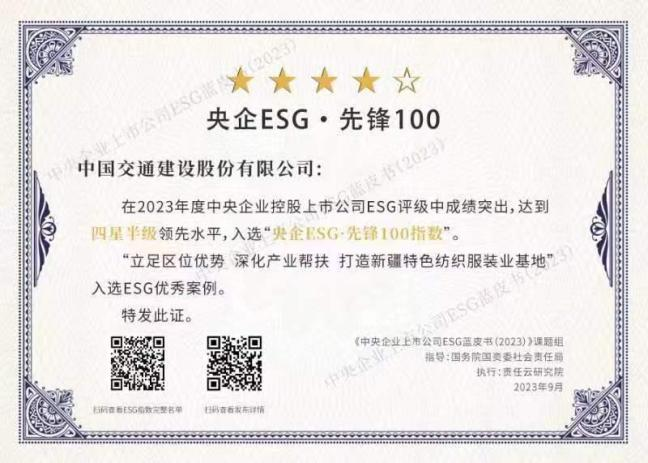 近日,由国务院国资委社会责任局指导、中国社会责任百人论坛承办的第六届中国企业论坛平行论坛“践行ESG理念,创建一流企业——中央企业ESG论坛”在山东济南召开。会议正式发布《中央企业上市公司ESG蓝皮书(2023)》和“央企ESG·先锋100指数”。中国交建和振华重工两家上市公司入选“央企ESG·先锋100指数”,中国交建《立足区位优势 深化产业帮扶 打造新疆特色纺织服装业基地》入选蓝皮书ESG优秀案例。